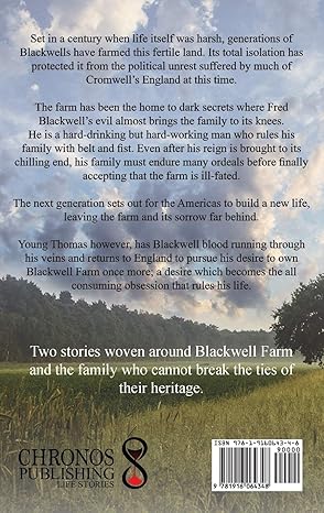 Generations of Blackwells have farmed this land, but its isolation has protected it from the political unrest suffered by much of England at this time. Fred Blackwell is a hard-working, hard-drinking man who rules his family with belt and fist. Even after his death, the family must endure many ordeals before finally accepting that the farm is ill-fated. They decide to leave and make a new life in the colonies. Young Thomas, however, has Blackwell blood running through his veins and returns to Cromwell’s England to pursue his desire to own Blackwell farm once more; a desire which becomes an obsession that rules his life.